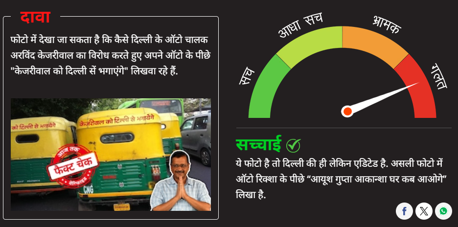 सोशल मीडिया पर एक फोटो शेयर किया जा रहा है. फोटो में देखा जा सकता है कि कैसे दिल्ली के ऑटो चालक अरविंद केजरीवाल का विरोध करते हुए अपने ऑटो के पीछे “केजरीवाल को दिल्ली सें भगाएंगे” लिखवा रहे हैं. यह दावा पूरी तरह गलत है. Post navigation खटीमा, मसूरी और रामपुर तिराहा की घटनाएं उत्तराखंड के काले अध्यायजिम ट्रेनर की शादी तय होने से नाराज थी एकता… कानपुर की उस महिला की कहानी जिसका कंकाल 4 महीने बाद DM आवास कैंपस से मिला