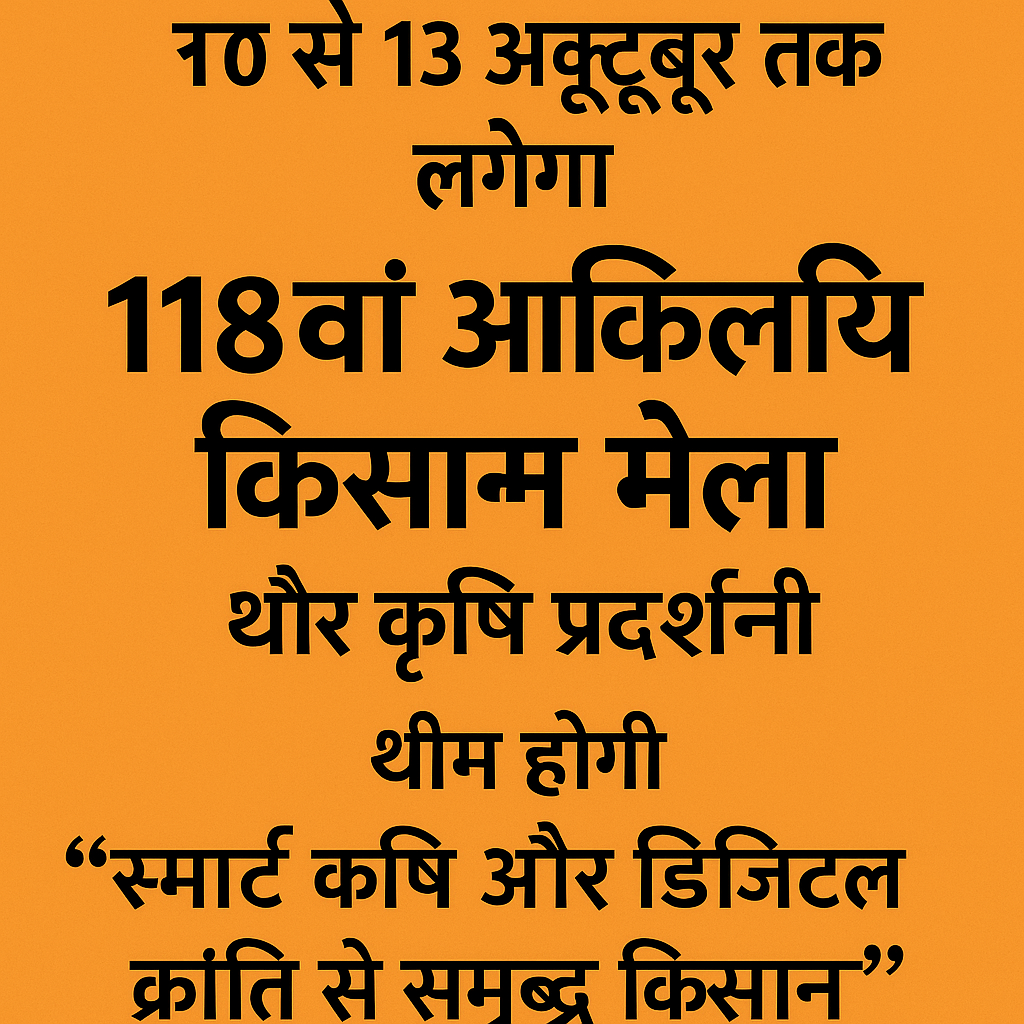 गोविंद बल्लभ पंत कृषि एवं प्रौद्योगिक विश्वविद्यालय (जीबी पंत विश्वविद्यालय) द्वारा 118वां अखिल भारतीय किसान मेला और कृषि प्रदर्शनी इस वर्ष 10 से 13 अक्टूबर तक आयोजित किया जाएगा। यह निर्णय सोमवार को कुलपति प्रो. मनमोहन सिंह चौहान की अध्यक्षता में आयोजित किसान मेला सलाहकार समिति की बैठक में सर्वसम्मति से लिया गया।
