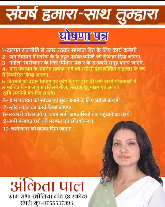 खोलियागाँव, अस्कोट (डीडीहाट)। २3 जुलाई, २०२५: डीडीहाट-अस्कोट क्षेत्र की स्थानीय राजनीति में अंकिता पाल की चुनावी दावेदारी ने नई उम्मीद का संचार किया है। क्षेत्र की प्रिय बेटी, स्वतंत्र चेतना और अदम्य साहस की प्रतीक अंकिता पाल ने ग्राम प्रधान पद के लिए अपनी उम्मीदवारी की चुनावी दावेदारी की है। यह केवल एक चुनावी दावेदारी नहीं, बल्कि संसाधनों के अभाव और सामाजिक चुनौतियों से जूझकर स्वावलंबन और समर्पण से ऊँचाइयाँ छूने वाली एक युवती के अटूट विश्वास और जनकल्याण के प्रति उसकी गहरी प्रतिबद्धता का जीवंत प्रमाण है।