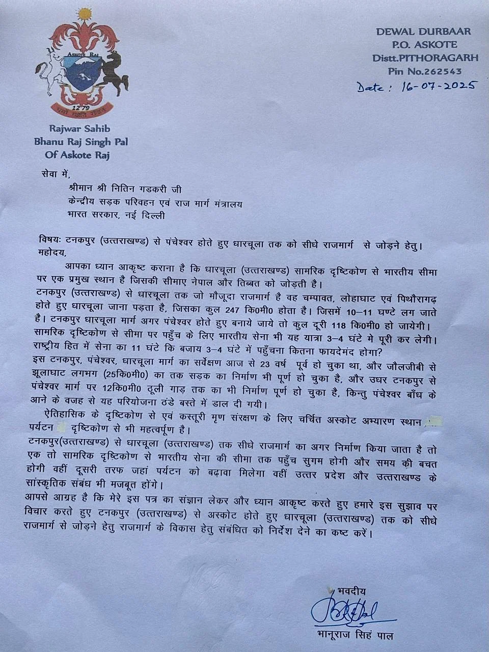 पिथौरागढ़ जिले के अस्कोट के राजवंशीय नेता भानुराज सिंह पाल ने केंद्रीय सड़क परिवहन एवं राजमार्ग मंत्री नितिन गडकरी को एक महत्वपूर्ण पत्र भेजा है। इस पत्र में उन्होंने टनकपुर से अस्कोट होते हुए धारचूला तक एक सीधे राष्ट्रीय राजमार्ग के निर्माण की मांग उठाई है। उनका तर्क है कि धारचूला, जो नेपाल और तिब्बत से सटी भारतीय सीमा का एक रणनीतिक महत्व का क्षेत्र है, वर्तमान में टनकपुर से जोड़ने के लिए कोई सीधा मार्ग नहीं है। वर्तमान में, यात्रियों को चंपावत, लोहाघाट और पिथौरागढ़ के रास्ते 10-11 घंटे की थकाऊ यात्रा करनी पड़ती है। वहीं, प्रस्तावित सीधे मार्ग से यह दूरी मात्र 3-4 घंटे में तय हो सकती है।