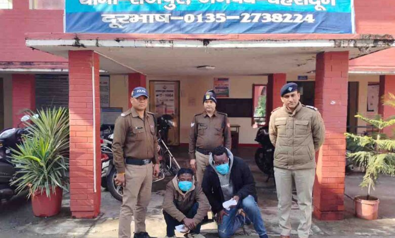 उन्होंने बताया कि पुलिस को कोबरा गैंग के सदस्यों के मादक पदार्थों की तस्करी के लिए आने की गोपनीय सूचना मिली थी जिसके बाद पुलिस ने रविवार को ओल्ड मसूरी रोड पर कुठाल गेट बैरियर के पास सघन चेकिंग की। पुलिस ने दो आरोपियों को गिरफ्तार किया, एक तंजानियाई व्यक्ति प्रिंसली (32) को 20 ग्राम कोकीन के साथ और एक जिम्बाब्वे के मखोसेलिज़वे (22) को 13 ग्राम कोकीन के साथ। एसएसपी ने कहा कि पुलिस ने वितरण के लिए एक इलेक्ट्रॉनिक तराजू और 90 प्लास्टिक पैकेट भी जब्त किए हैं