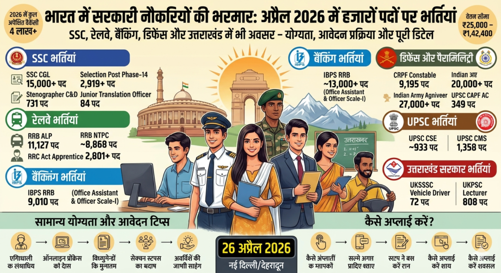भारत में सरकारी नौकरियों की भरमार: अप्रैल 2026 में हजारों पदों पर भर्तियां, SSC, रेलवे, बैंकिंग, डिफेंस और उत्तराखंड में भी अवसर – योग्यता, आवेदन प्रक्रिया और पूरी डिटेल
